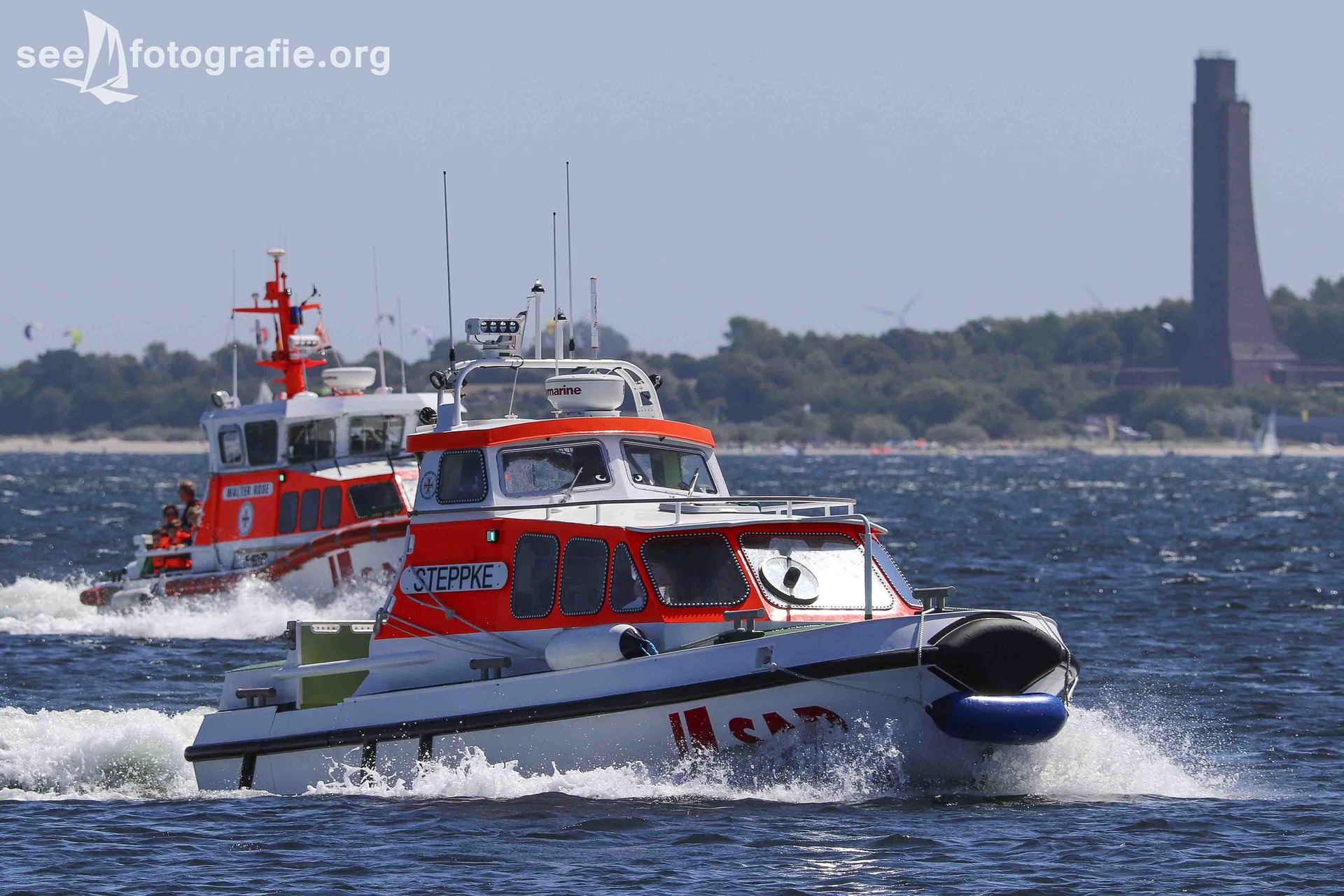 Da der Seenotkreuzer zu groß und einen zu großen Tiefgang für den Hafen Schilksee hat, blieb der Kreuzer vor der Hafeneinfahrt liegen und schickte zu Besuch "nur" das kleinere Tochterboot STEPPKE.