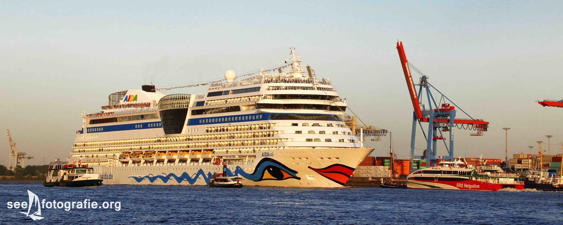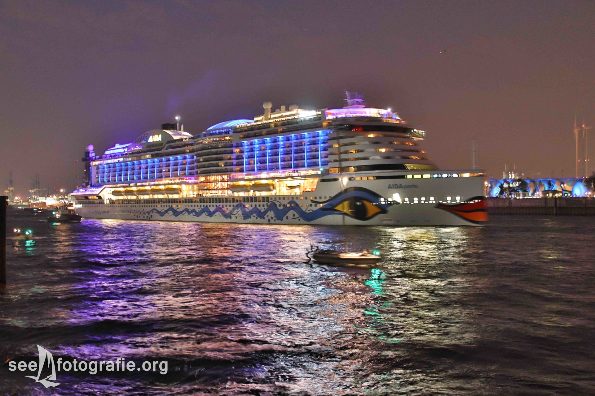 Da am Abend ein großes Feuerwerk von AIDA angekündigt war, wiederholte sich wieder der Ablauf vom Vortag. Eine Stunde bevor das Feuerwerk beginnen sollte, trafen wir an den Landungsbrücken ein. Voller Entsetzen stellten wir fest, dass sowohl die Landungsbrücken als auch der Stintfang vollkommen besetzt waren. Schnell sahen wir ein, dass es dort keine freien Plätze mehr gab. Aus diesem Grund liefen wir zügig in Richtung Altona, in der Hoffnung, dass dort weniger Leute stehen. Doch diese Hoffnung wurde enttäuscht. Enttäuscht mussten wir einsehen, dass uns wohl kein Bild mehr von diesem sehr spektakulären Feuerwerk gelingen würde. Aus diesem Grund beschlossen wir, dass wir die AIDA PERLA nun wenigstens noch auslaufend fotografieren. Dies gelang uns dann auch.