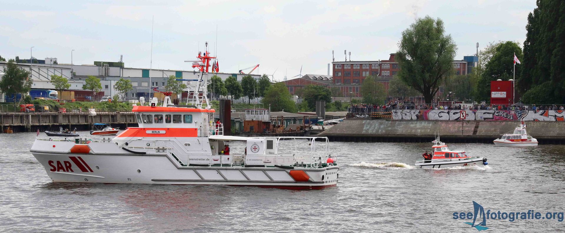 Am Freitag war unser erstes Ziel der Liegeplatz der BERLIN. Sie lag im Brandenburger Hafen, wo unter anderen auch Schiffe der Bundespolizei, der Bundesmarine und dänische Marineheimwehrkutter lag. Das Open-Ship nutzten wir, um uns auf dem Seenotkreuzer umzusehen. Das ehemalige Seenotrettungsboot PUTBUS, wurde vor einiger Zeit aus der Flotte der Seenotretter entlassen und der DLRG in Hamburg übergeben, natürlich machten wir auch von diesem Boot Bilder. Als es dann wieder wegfuhr, gingen wir auch weiter, schauten uns im Hafen um, fotografierten und genossen die maritime Stimmung.