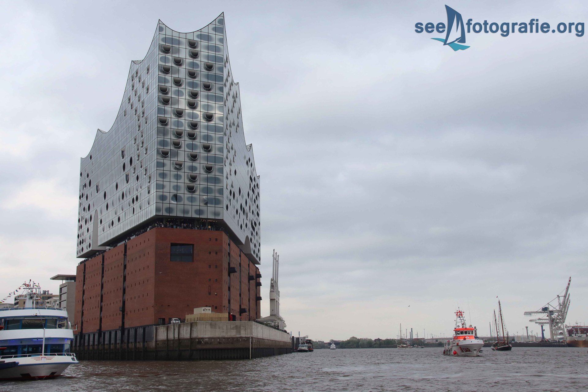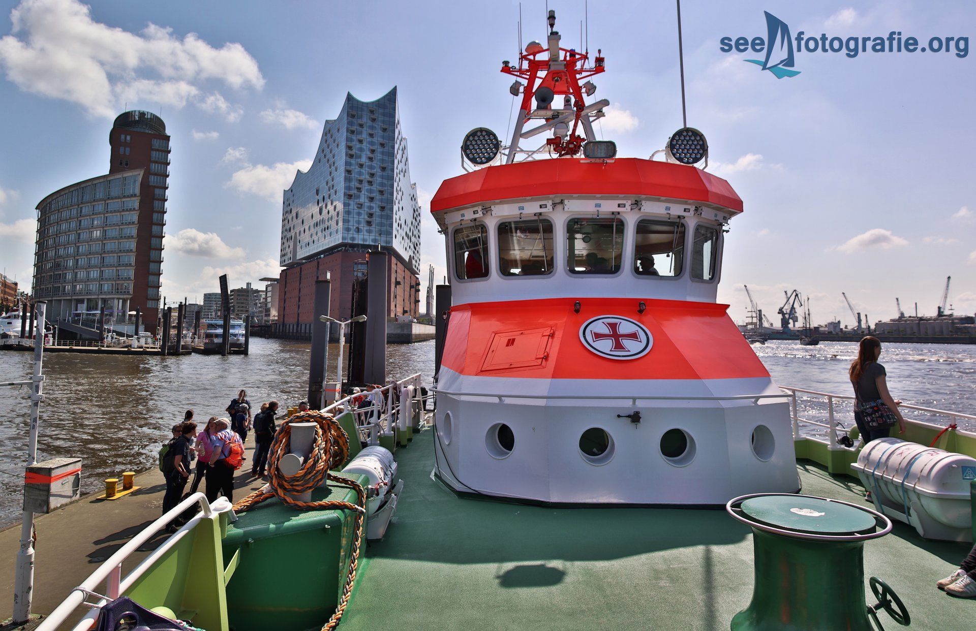Am Samstag wollten wir die Vorführung "SOS - Retter in Aktion" von der anderen Elbseite aus verfolgen. So gingen wir also zum alten Elbtunnel und unterquerten die Elbe, suchten uns dann einen schönen Platz zum Fotografieren und warteten bis die Vorstellung begann. Die Sonne im Rücken genossen wir dabei sehr, denn sie war sommerlich warm und spendete sehr gutes Licht. Glücklicherweise fuhr ein Kreuzfahrschiff an den Landungsbrücken vorbei, was ein schönes Bild abgab.