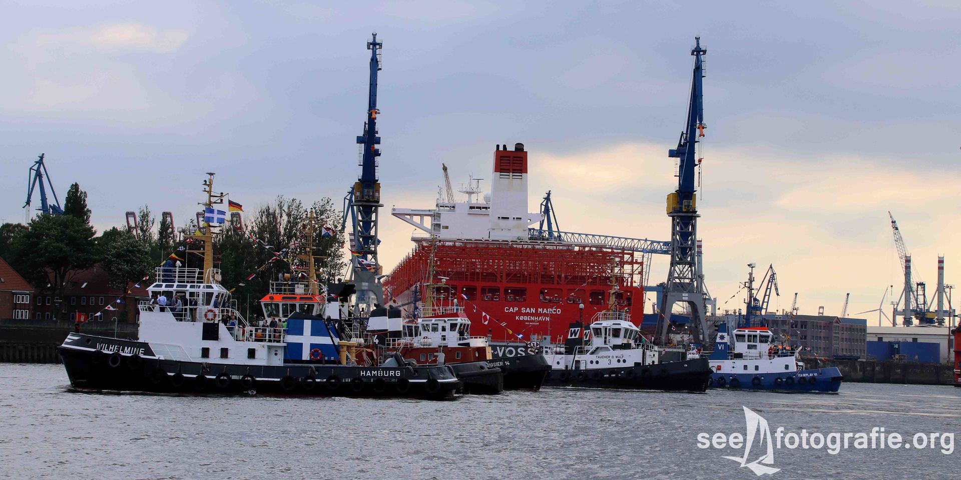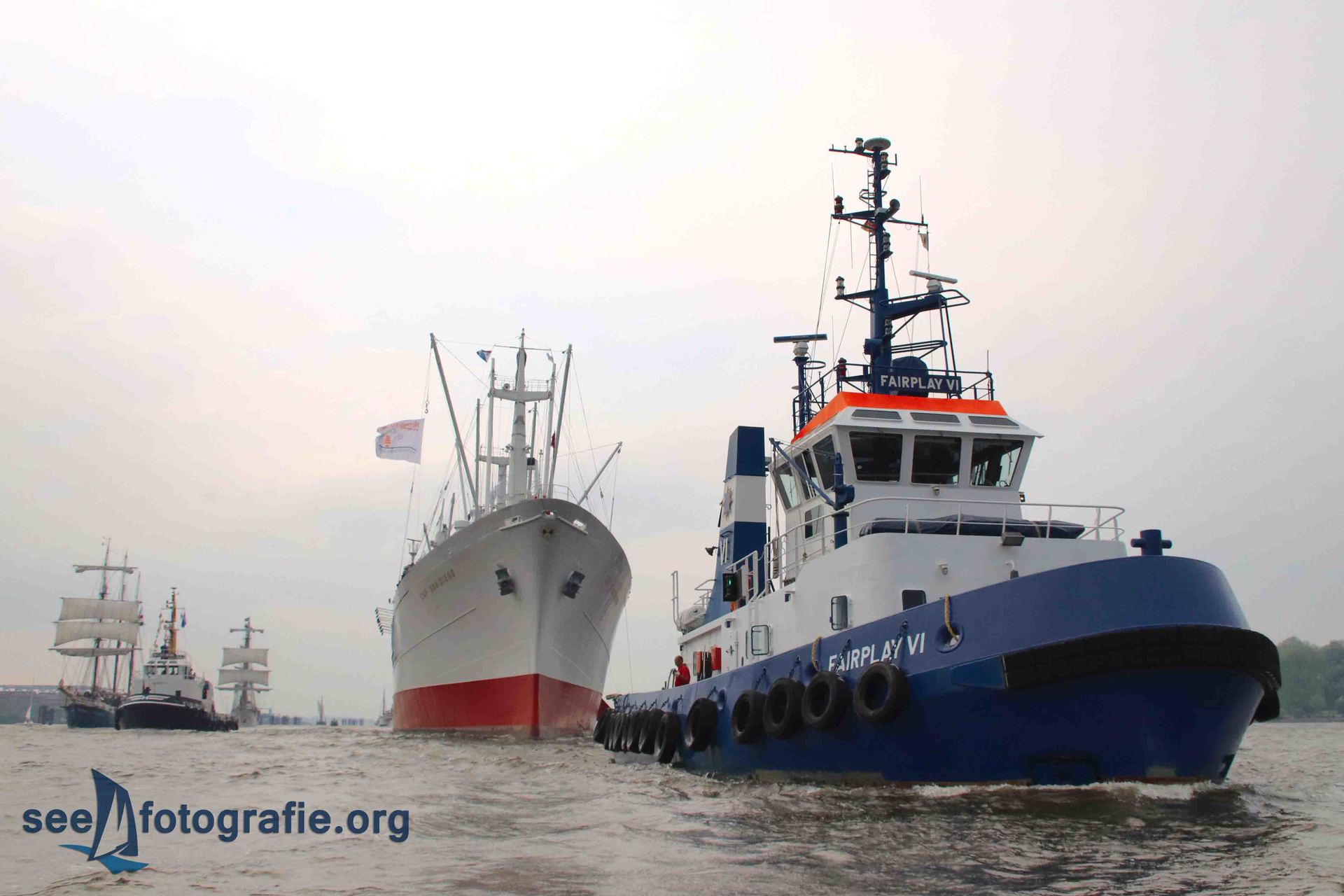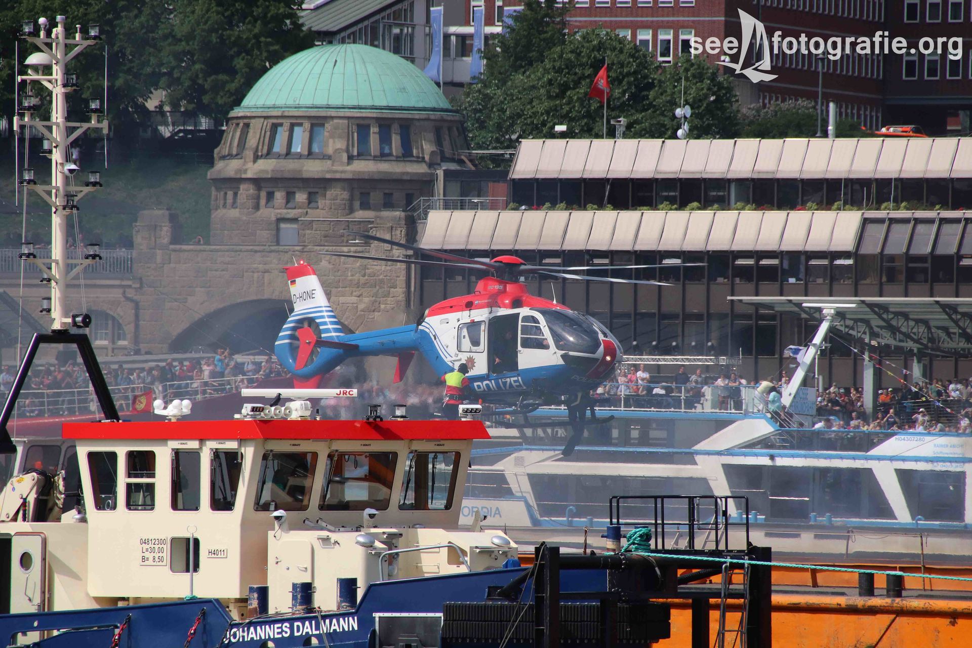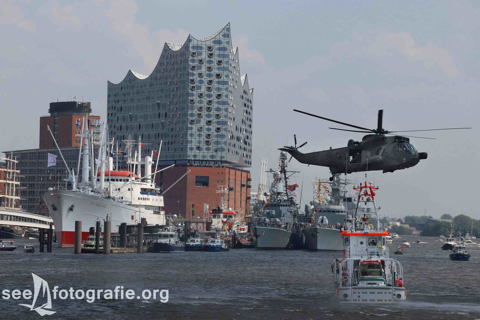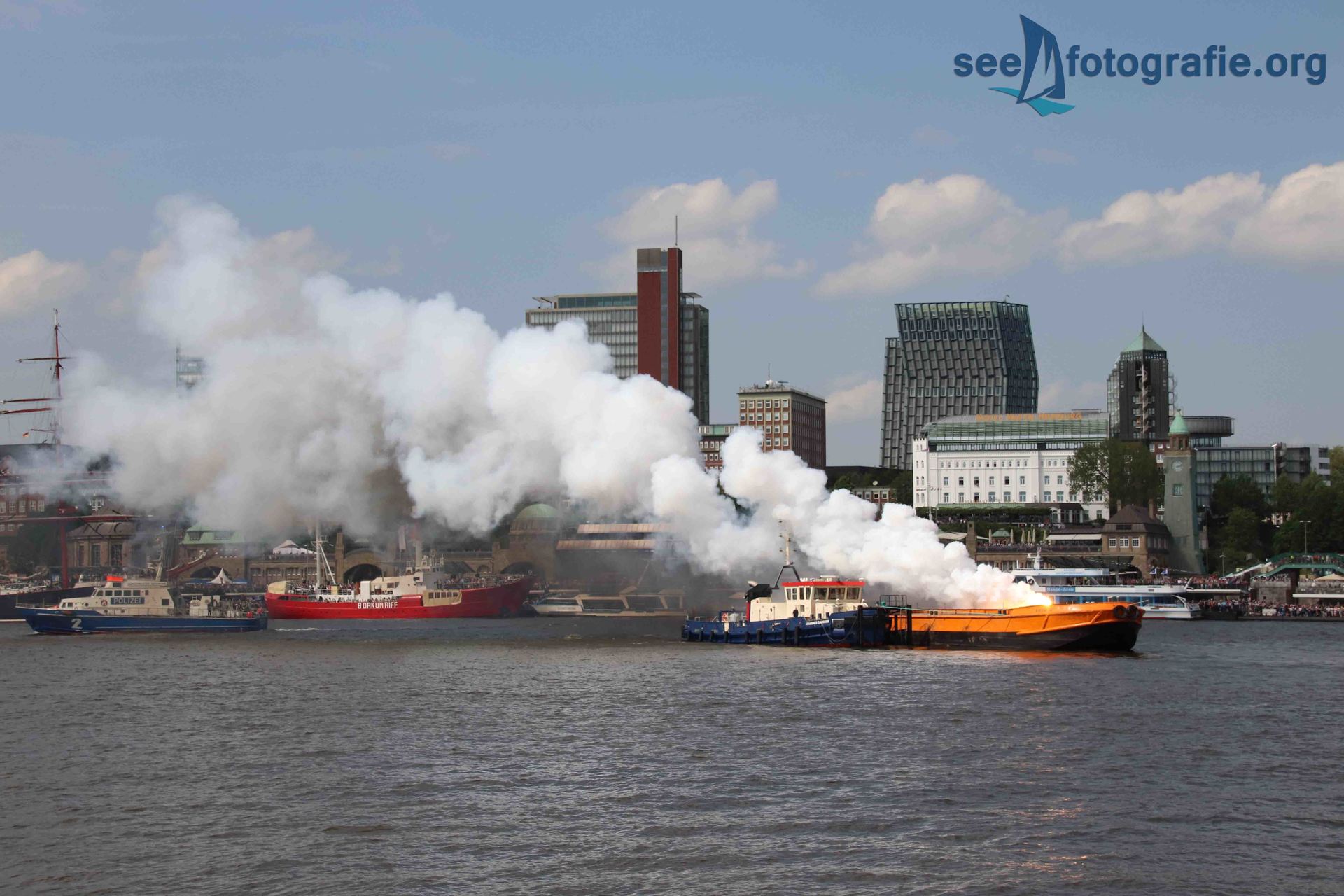 Nachdem der SEA KING zusammen mit dem Polizeihubschrauber abgeflogen waren und wieder Ruhe einzog, packten wir unsere Sachen, setzen unsere Rucksäcke auf und liefen wieder Richtung Elbtunnel. Diesen durchquerten wir und suchten uns einen noch freien Platz. Vom angekündigten Schlepperbalett sind wir eigentlich nicht so angetan, weil weniger Action geboten wird, als zum Beispiel bei der Tochbootfahrt, dennoch schauten wir uns das Spektakel an.