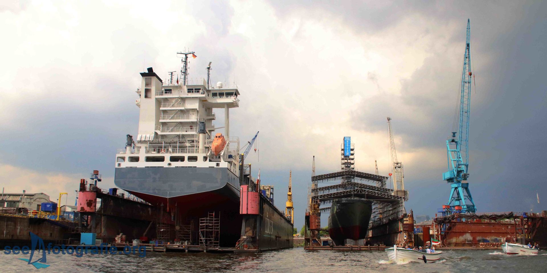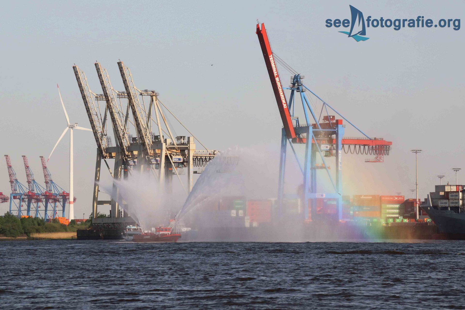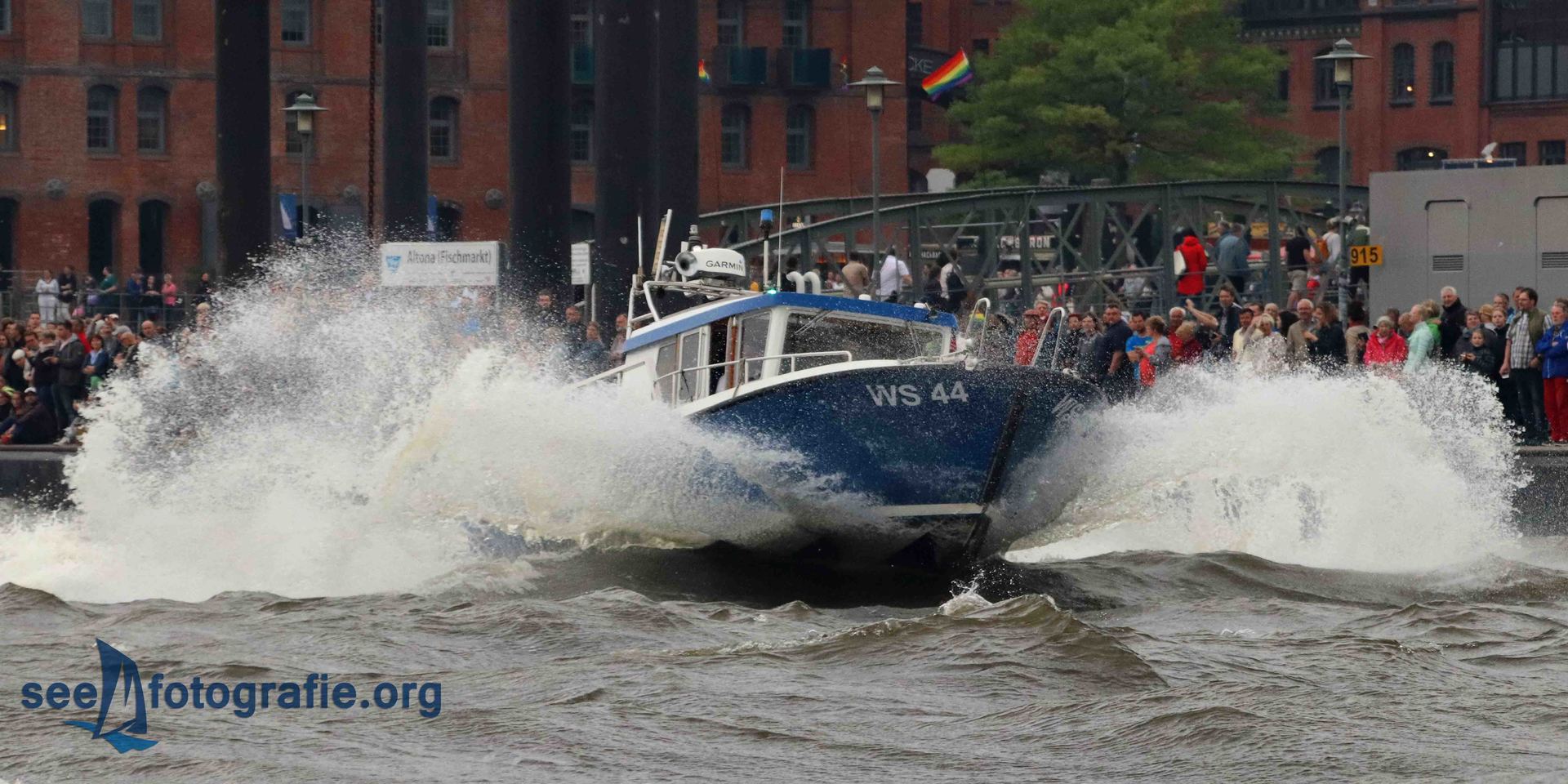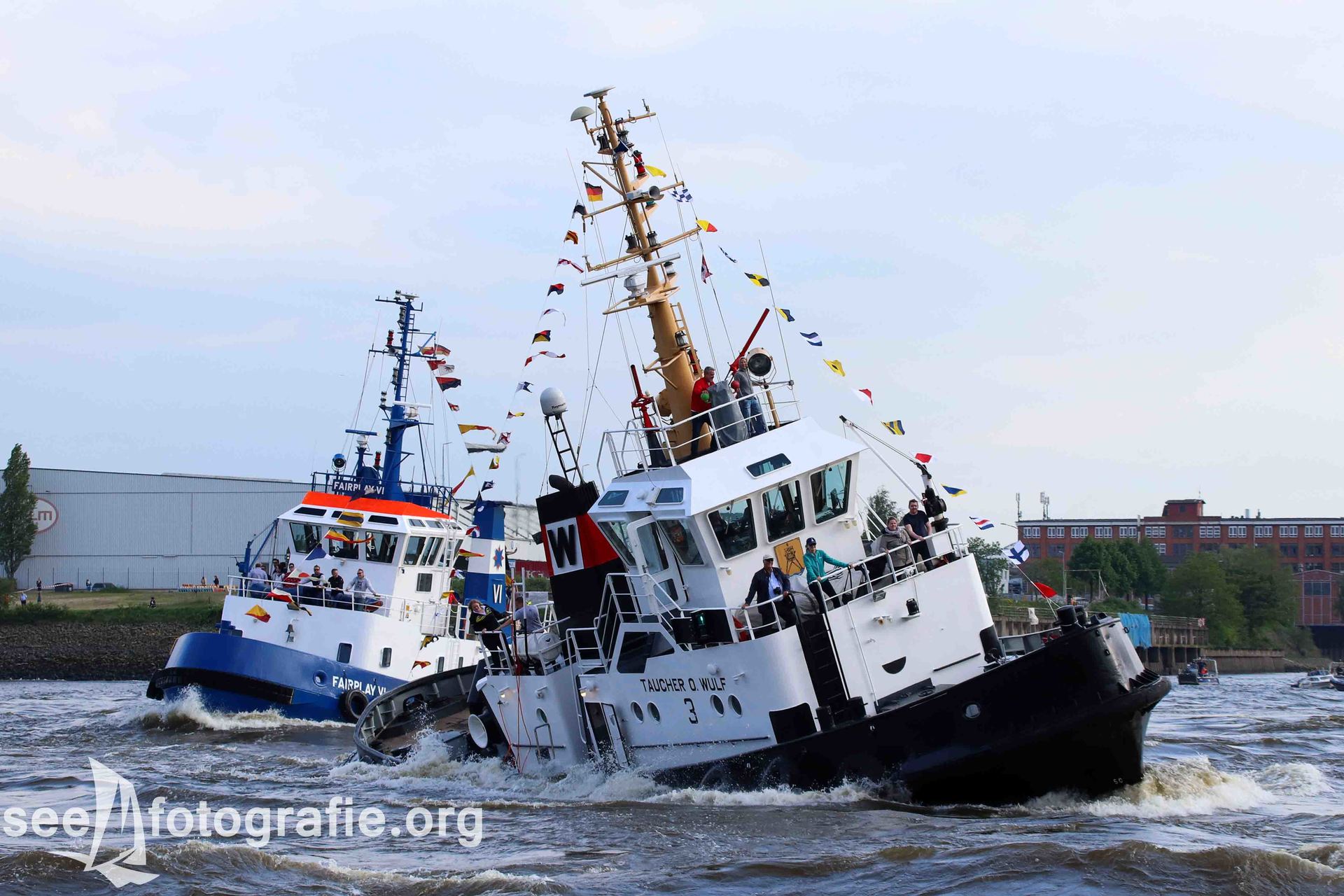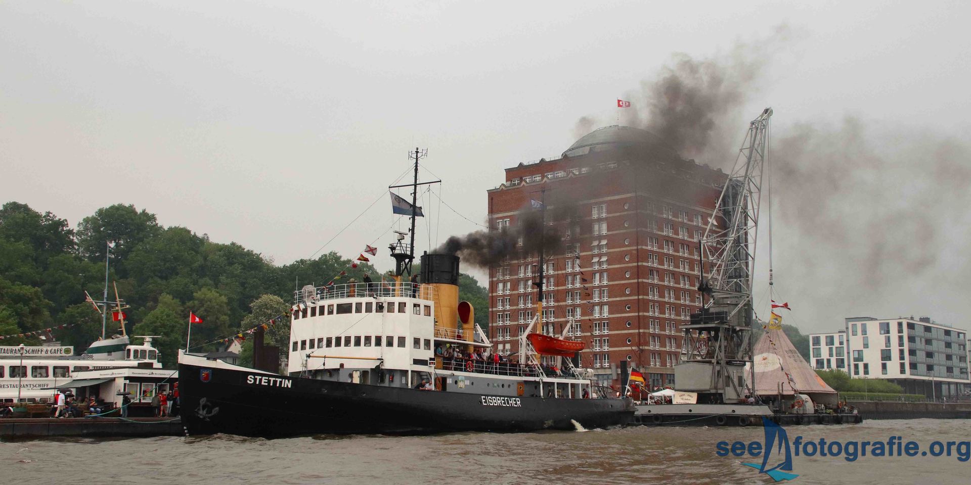Nachdem der SEA KING zusammen mit dem Polizeihubschrauber abgeflogen waren und wieder Ruhe einzog, packten wir unsere Sachen, setzen unsere Rucksäcke auf und liefen wieder Richtung Elbtunnel. Diesen durchquerten wir und suchten uns einen noch freien Platz. Vom angekündigten Schlepperbalett sind wir eigentlich nicht so angetan, weil weniger Action geboten wird, als zum Beispiel bei der Tochbootfahrt, dennoch schauten wir uns das Spektakel an.