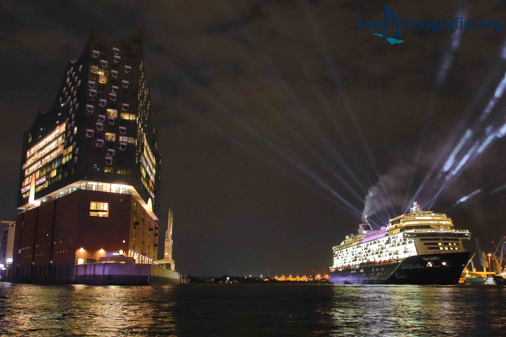 Am Dockland angekommen stellten wir dann unsere Stative auf und stellten unsere Kameras ein. Leider ging die Taufe völlig unter und so waren wir ganz überrascht als auf einmal das Feuerwerk zündete. Als dieses dann vorbei war, standen wir ganz schnell einsam am Elbufer, da die ohnehin die wenigen Schaulustigen schnell verschwunden waren. Da wir allerdings wussten, dass die MEIN SCHIFF 1 nach der Taufe noch bis zur Elbphilharmonie fahren sollte, planten wir so lange zu bleiben bis sie an uns vorbei fuhr. Es dauerte uns zu lange und so fuhren wir enttäuscht mit der Fähre zu den Landungsbrücken zurück. In dem Moment als wir dort ankamen, sahen wir jedoch dass sie es mittlerweile geschafft hatte abzulegen. Im Laufschritt liefen wir in den Brandenburger Hafen, um das frisch getaufte Schiff zusammen mit der Elbphilharmonie zu fotografieren. Auf unserem Weg in den Brandenburger Hafen mussten wir feststellen, dass Niemand mehr am Elbufer stand und somit die Fahrt der MEIN SCHIFF 1 kaum beachtet wurde. Eine Taufe an den Landungsbrücke hätte sicher eine bessere Wirksamkeit gehabt. Als die MEIN SCHIFF 1 dann gedreht hatte und an uns wieder vorbeigefahren war, war es schon weit nach Mitternacht. Trotzdem machten wir uns nochmal auf den Weg in die Hafencity um Nachtbilder zu machen. Dies führe dazu, dass wir einmal vom Wachschutz angesprochen wurden, was wir denn um diese Zeit noch hier wollen. Nachdem wir dann nach einiger Zeit alle Motive fotografiert hatten, machten wir uns zurück auf den Weg in unsere Unterkunft. Als wir ankamen und einschlafen wollten, wurde es allerdings schon wieder hell und die ersten Vögel begannen ihr “Konzert”.