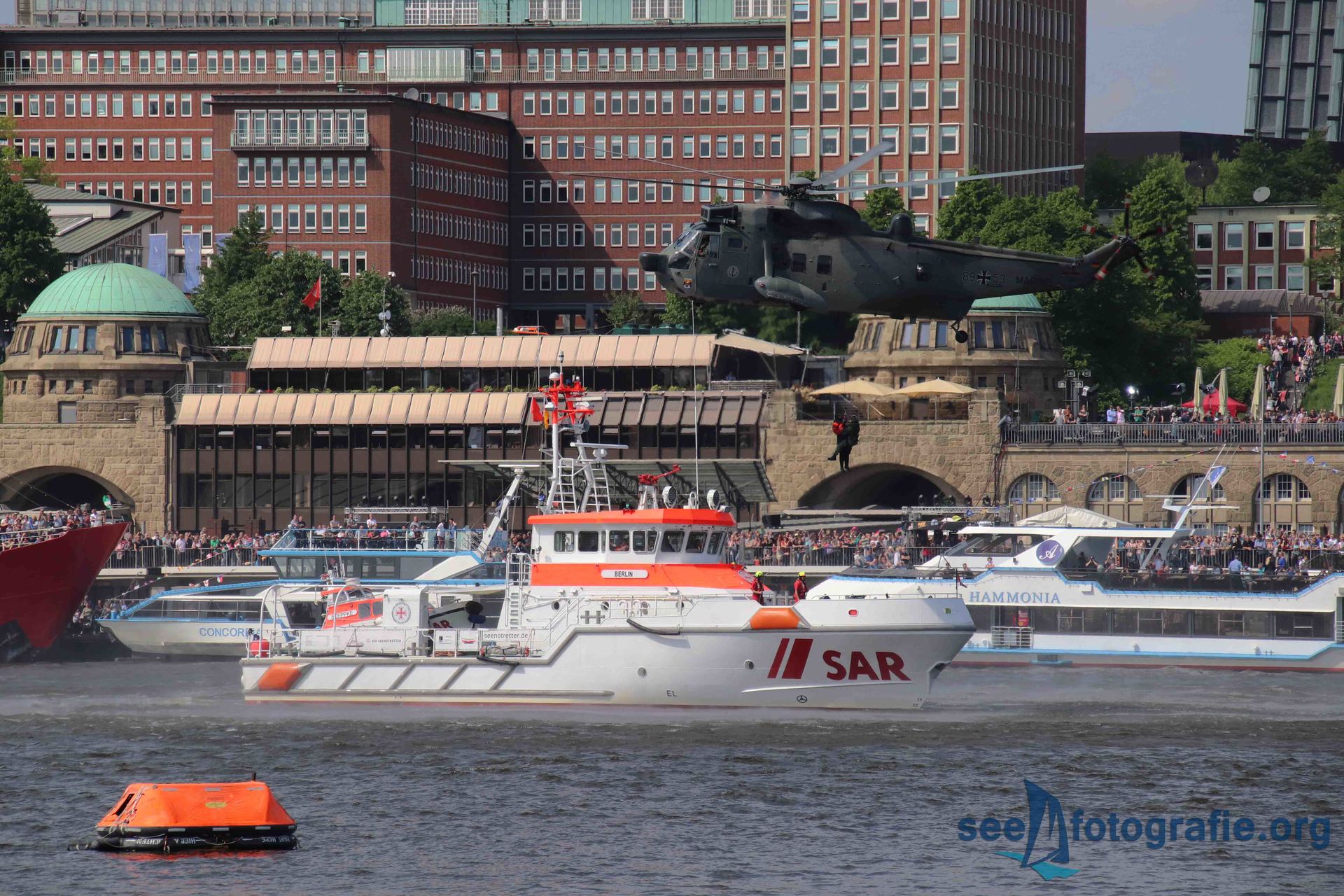 An den Landungsbrücken lag das ehemalige Feuerschiff BORKUMRIFF. Mit einer Spende an den Verein, welcher sich um den Erhalt des Schiffes kümmert, erhielten wir Zutritt auf das Schiff. Vom Vorschiff aus hatten wir perfekten Blick auf die Elbe. Nun warteten wir auf den Programmpunkt "SOS - Retter in Aktion". Die Retter sind Männer und Frauen der Feuerwehr, THW, DLRG, Polizei, Marine und der DGzRS. Das gezeigte Szenarium begann mit dem Ausbrechen eines Feuers auf einem Lastkahn. Daraufhin kam ein Polizeihubschrauber mit Rettungsschwimmer herangeflogen. Die Retter sprangen ab und retteten die Überbordgegangenen auf das Tochterboot des Polizeikreuzers BÜRGERMEISTER WEICHMANN, danach kümmerte sich die Hamburger Feuerwehr mit dem Löschboot BRANDDIREKTOR KRÜGER um den gezeigten Brand. Da noch weitere Rettungsaktionen gezeigt werden sollten, kam jetzt der Seenotkreuzer BERLIN zum Einsatz: Das Tochterboot STEPPKE wurde zu Wasser gelassen und nahm aus einer zuvor vorbereiteten Rettungsinsel zwei Schiffbrüchige auf. Nach einer kleinen Runde wurde STEPPKE wieder auf die BERLIN gezogen und ein zweiter Hubschrauber kam heran geflogen: Ein SEA KING aus Nordholz kam nach Hamburg geflogen, um uns Zuschauern zu zeigen, wie Gerettete im Ernstfall weiter versorgt werden. Vom Vorschiff der BERLIN wurden die Zwei in den Marinehubschrauber gewincht. Nach einem gemeinsamer Überflug beider Hubschrauber war die Vorstellung vorbei, dennoch blieben wir auf der BROKUMRIFF und warteten auf den nächsten Punkt des Programms.