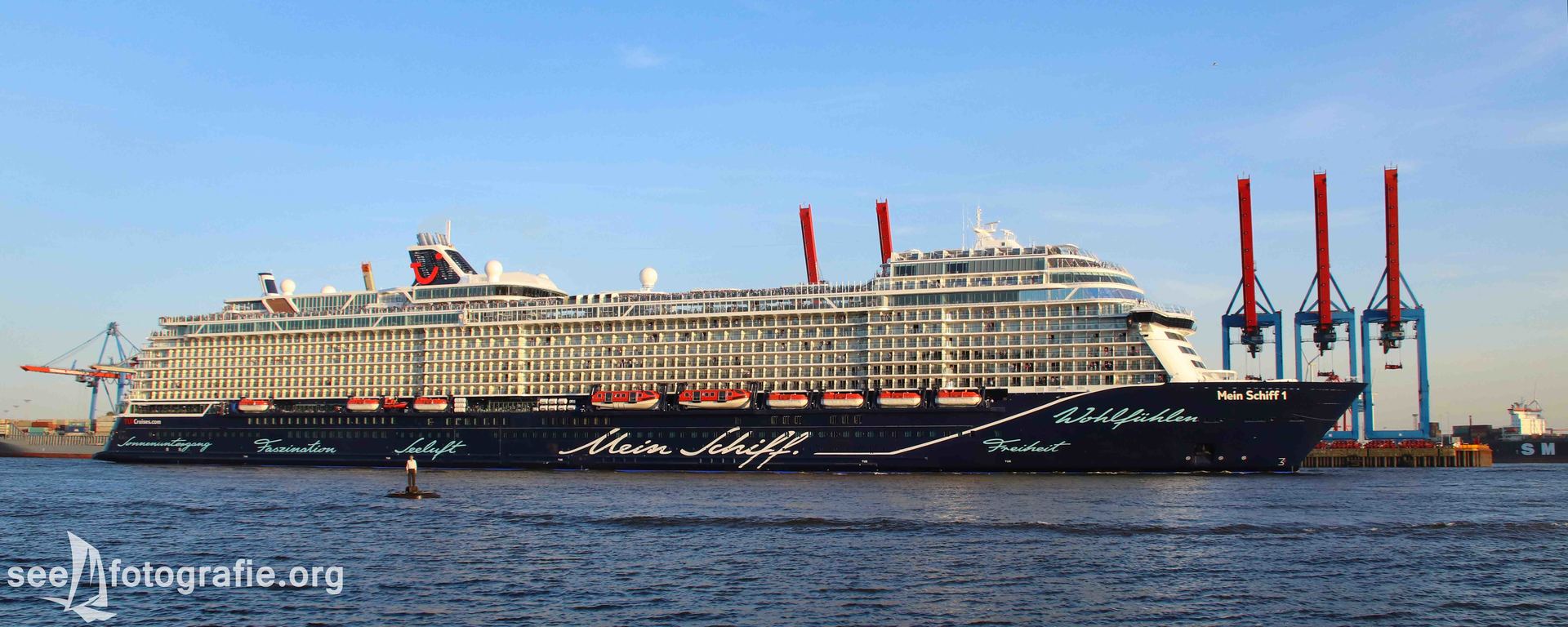 Wir stärkten uns kurz in unserer Unterkunft und holten unsere Stative, da wir in der Speicherstadt sowie die Taufe der MEIN SCHIFF 1 fotografieren wollten. Wir fuhren mit der Hochbahn bis in die Hafencity und von dort erkundigten wir die Speicherstadt. Nachdem wir die Bilder gemacht hatten die wir wollten, liefen wir schnell bis zu den Landungsbrücken und nahmen von dort die Fähre 63 bis zum Dockland. Wenn man diese Fähre nutzt und eine Hamburg-Card besitzt, hat man die Möglichkeit für ganz wenig Geld die Route zu fahren, welche auch zu überteuerten Preisen als Hafenrundfahrt angeboten wird.