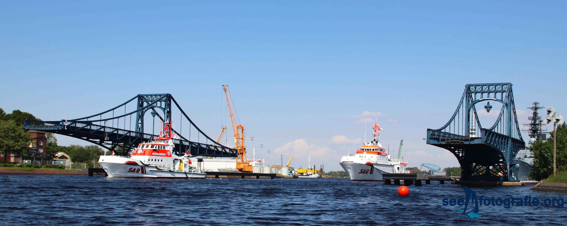 Nach der kleinen Hafenrundfahrt steuerten wir gemeinsamen mit anderen DGzRS-Fans einen Imbiss an. Hier konnten wir uns bei netten Gesprächen stärken. Nun hieß es auch schon wieder, dass die letzte Übung zu Ende sei und die Einheiten bald wieder einschleusen wollten. Da wir keine Fahrräder mehr hatten, dachten wir schon, dass wir das Einlaufen wohl leider verpassen würden. Doch glücklicher Weise erklärten sich zwei DGzRS-Fans bereit uns in ihren Autos mit zunehmen. Vielen Dank nochmals an euch beide dafür! Nachdem wir erst wieder am Rüstringer Berg standen, fuhren wir nach dem recht unspektakulären Einlaufen schnell zur Kaiser-Wilhelm-Brücke. Hier schoben sich die Einheiten eindrucksvoll durch das über 100-Jahre alte Wunderwerk der Technik.