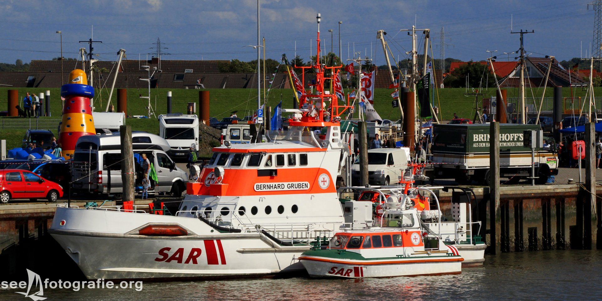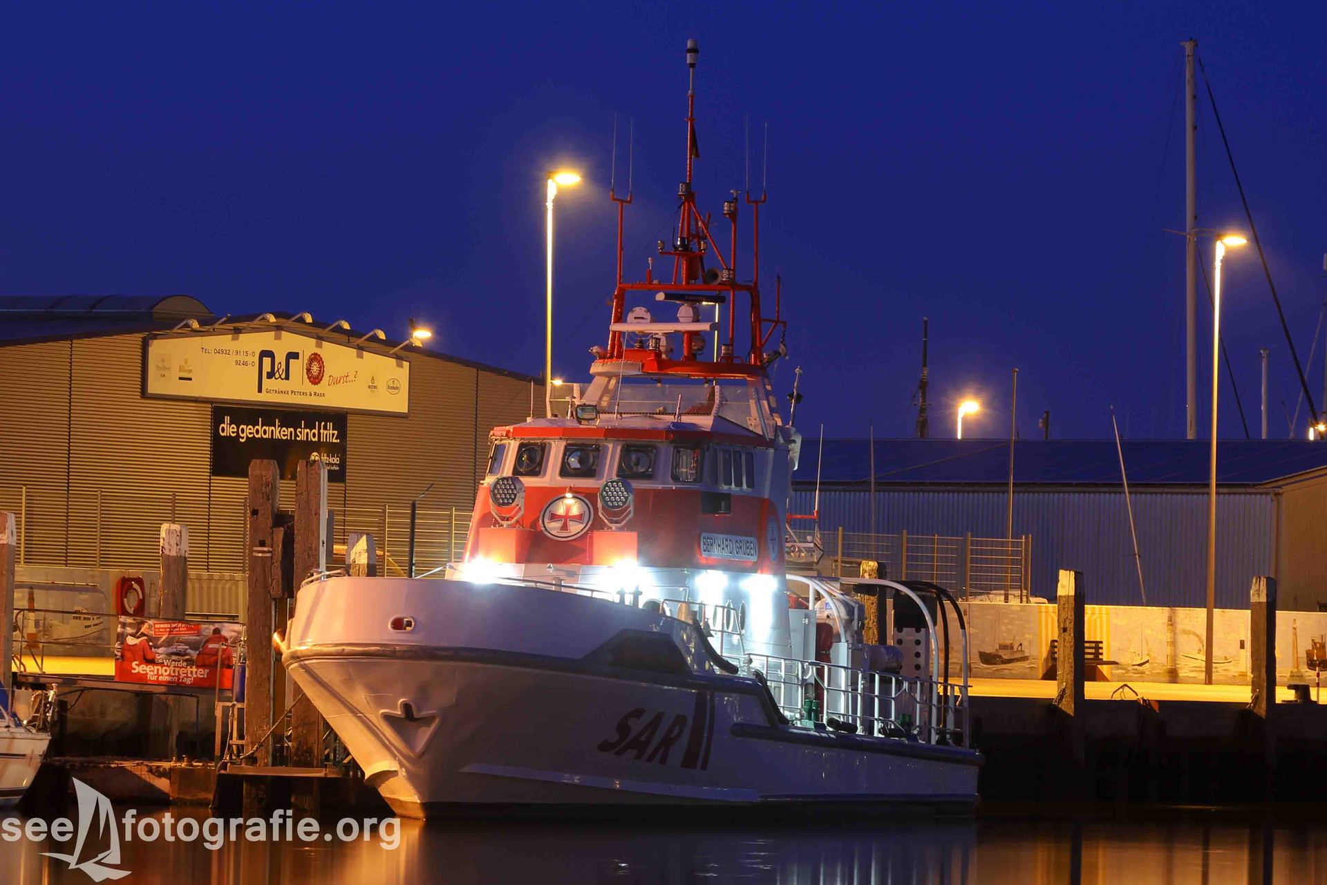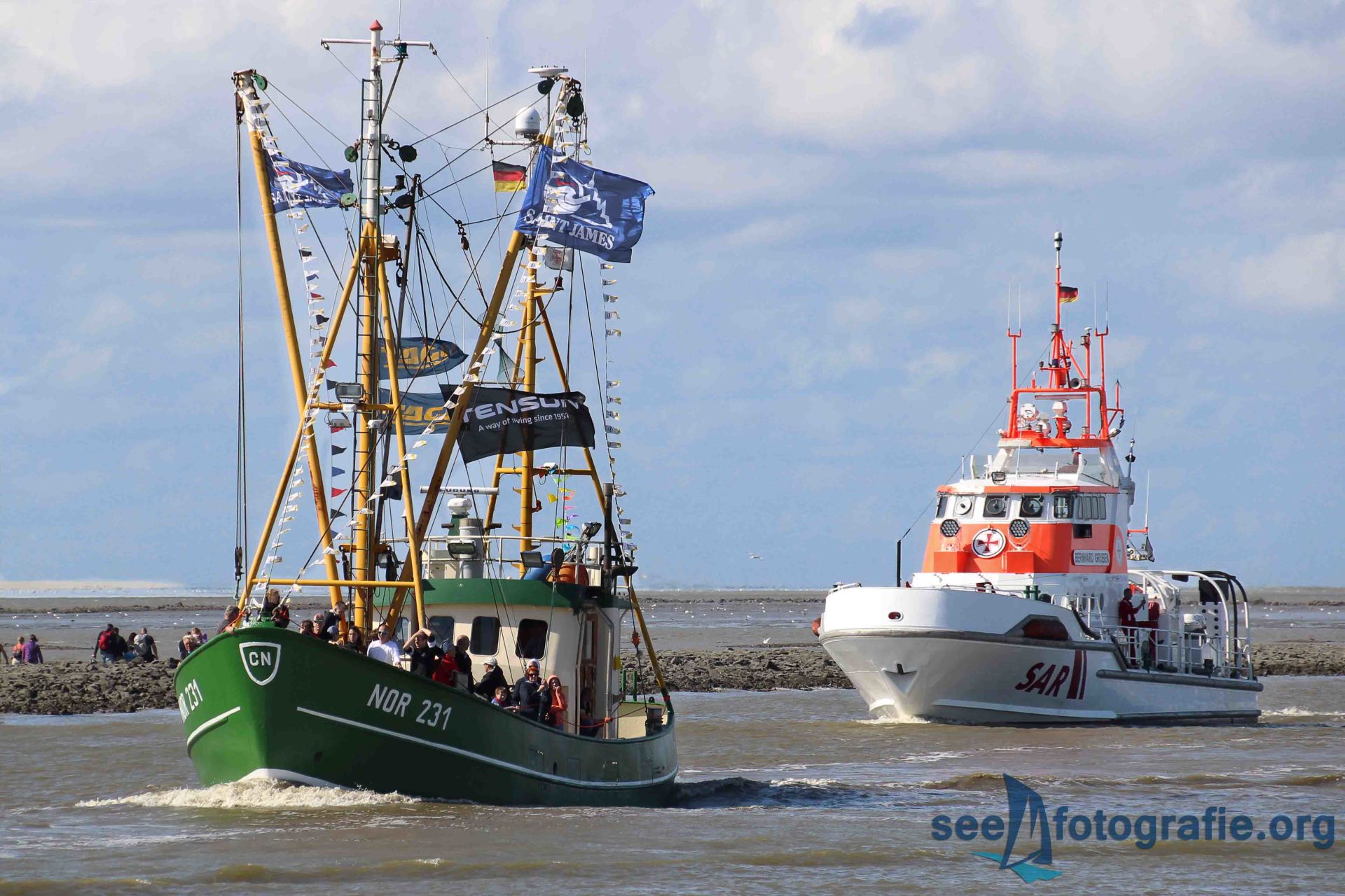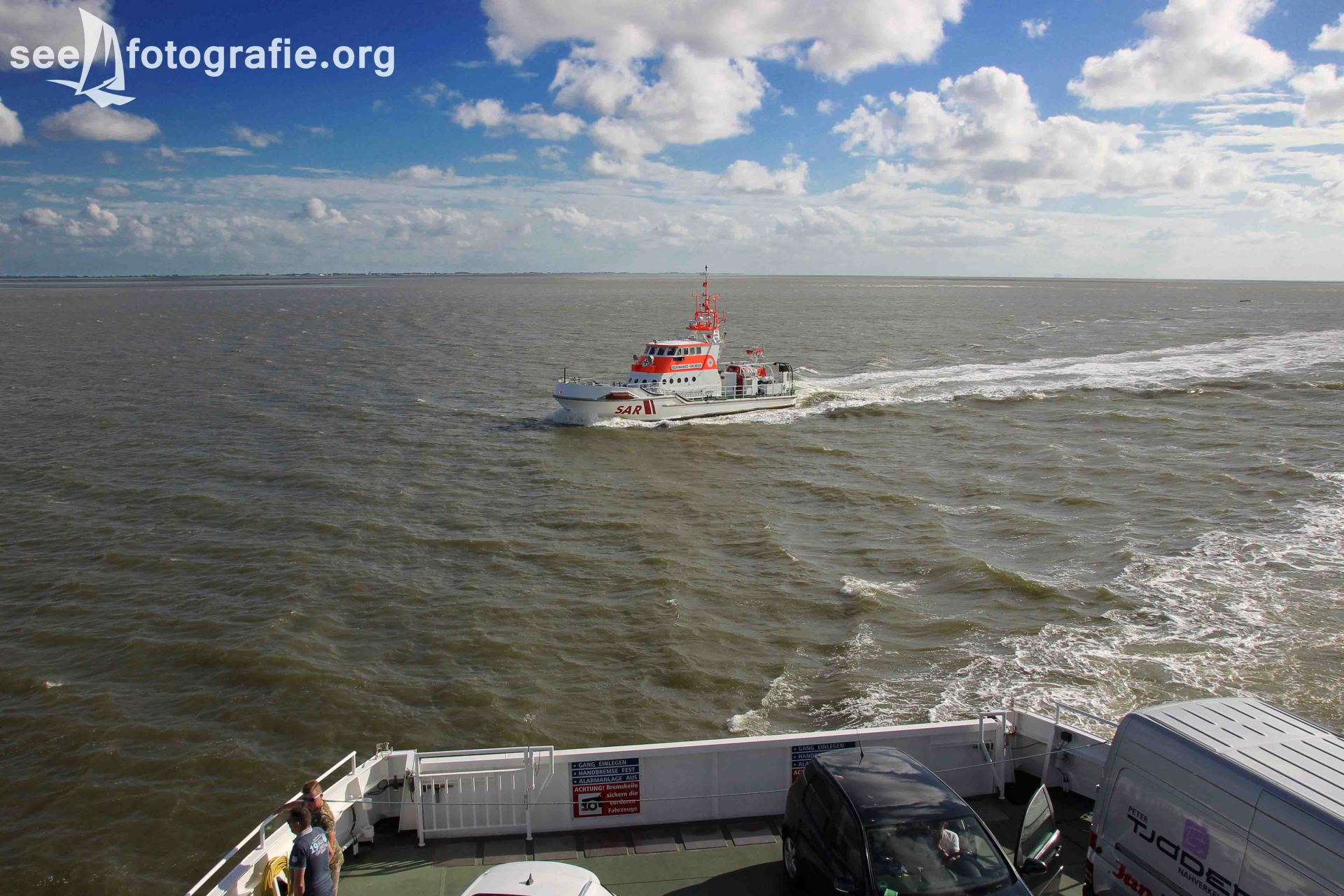 Durch das Trockenlegen verpassten wir leider die Fähre, mit der wir nach Norddeich fahren wollten. Nichts ahnend nahmen wir die Nächste, um hoffentlich noch rechtzeitig anzukommen. Am selben Tag fand nämlich der Norddeicher Kutterkorso statt, bei dem die Seenotretter ebenfalls ein Programm vorführten. Die Seenotretter der Stationen Norddeich und Norderney fahren dann mit den Kuttern herraus, um zu zeigen was sie können. Geplant war also, solch eine Besucherfahrt mit zu erleben um die CASSEN KNIGGE ablichten zu können. Doch als wir in Norddeich ankamen, kam diese aus dem Hafen geschossen - ein sehr schlechtes Zeichen. Das Seenotrettungsboot fuhr mit den Kuttern, der BERNHARD GRUBEN entgegen, um die Vorführung durchzuführen.