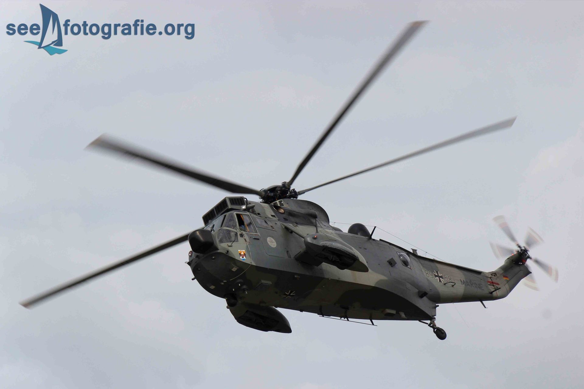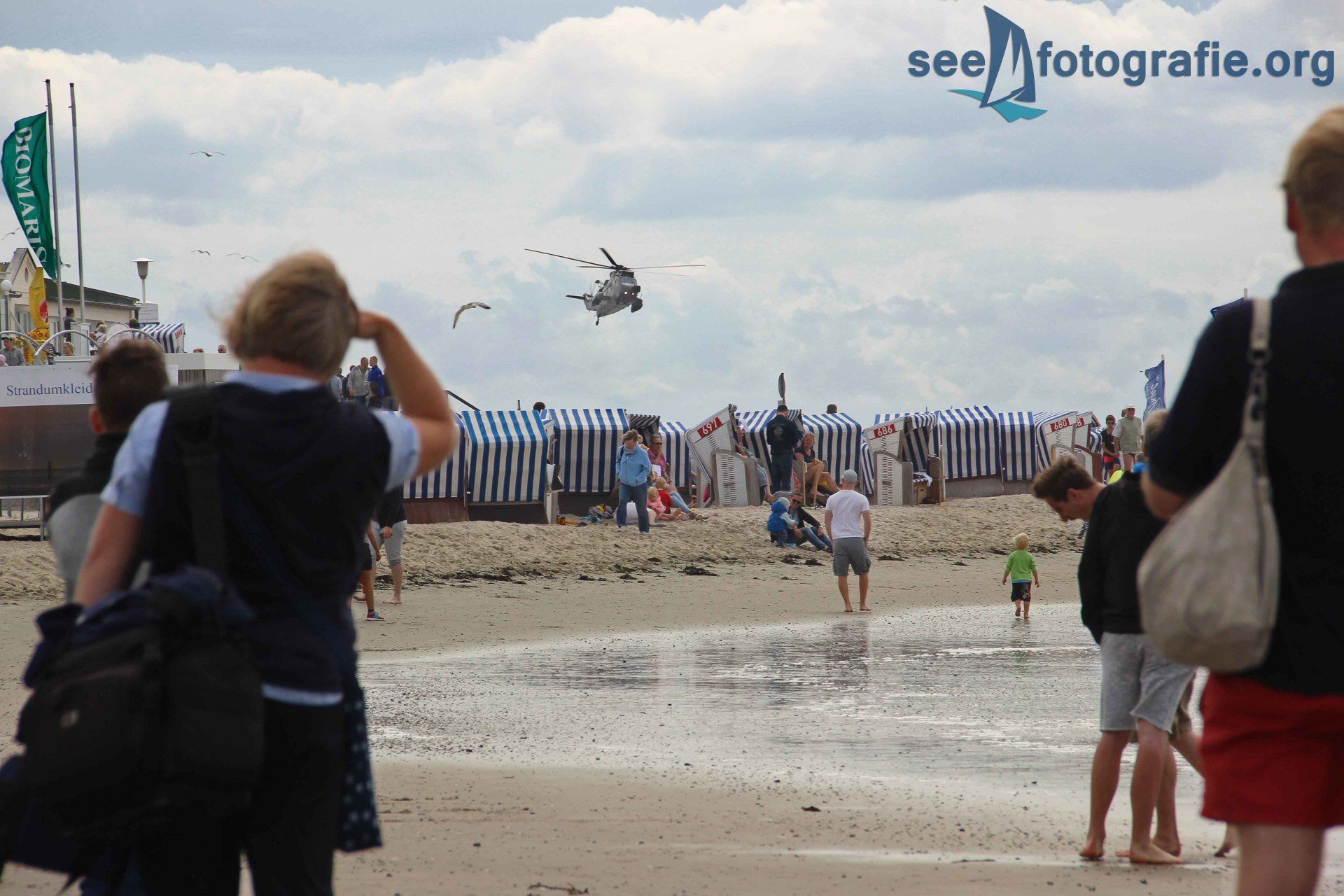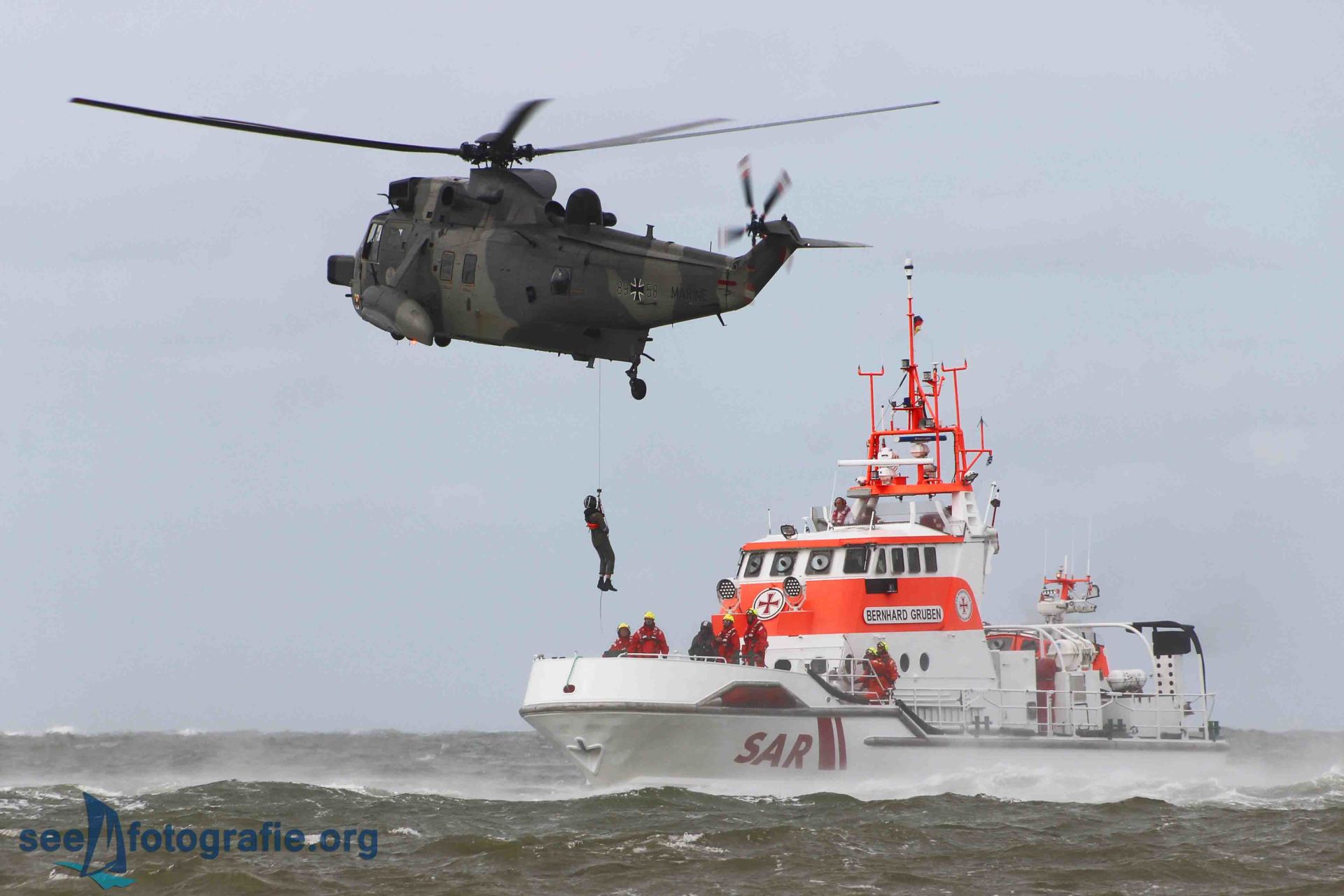 Ein Rettungshubschrauber des Typs SEAKING kam ebenfalls angeflogen, und es wurden die fliegerischen Besonderheiten des Hubschraubers und die Leistungsfähigkeit seiner Piloten gezeigt. Gemeinsam mit der Besatzung der BERNHARD GRUBEN wurden mehrere Personen vom Vordeck des Seenotkreuzers ab geborgen. Das Winchen wurde mehrmals wiederholt, gut erkennbar wurde, wie eingespielt die Besatzungen sind. Im Ernstfall eines Seenotfalls muss jeder Handgriff sitzen und so üben die Seenotretter regelmäßig gemeinsam mit den Marinefliegern.
