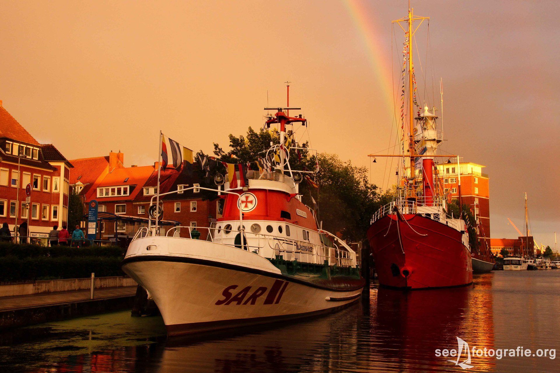 In Emden gab es dann die Entschädigung: ein toller Sonnenuntergang mit gleichzeitigen Regenbogen. Eine klasse Atmosphäre ergab sich in der gesamten Stadt, so auch im Ratsdelft, wo die GEORG BREUSING als Museumskreuzer auf Besucher wartet.
