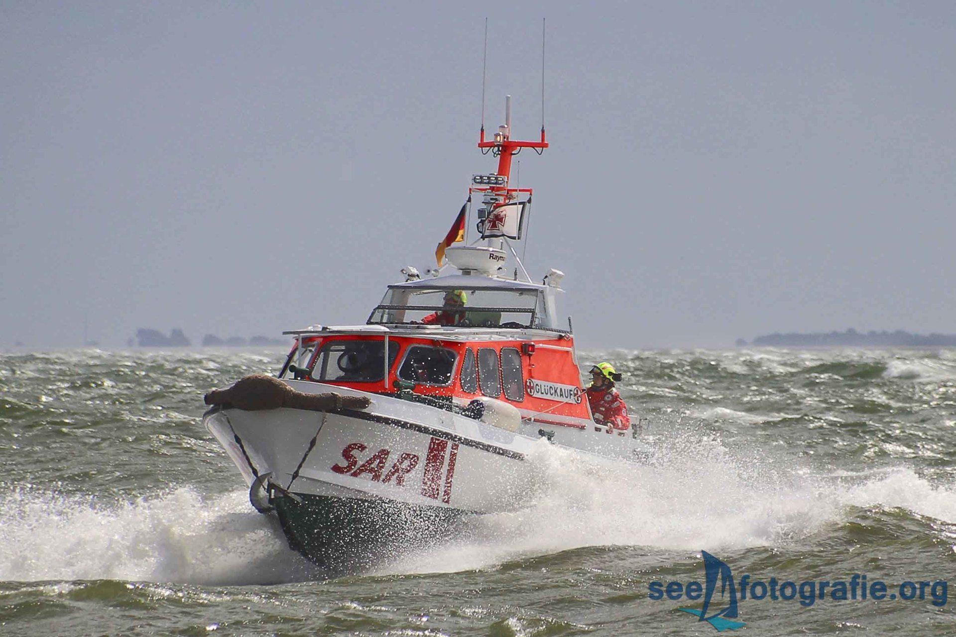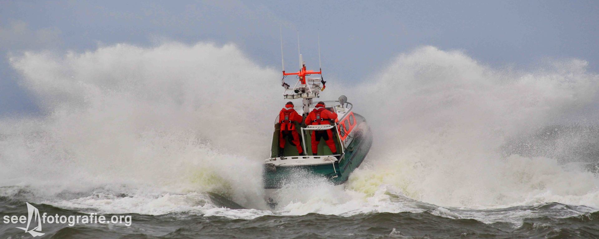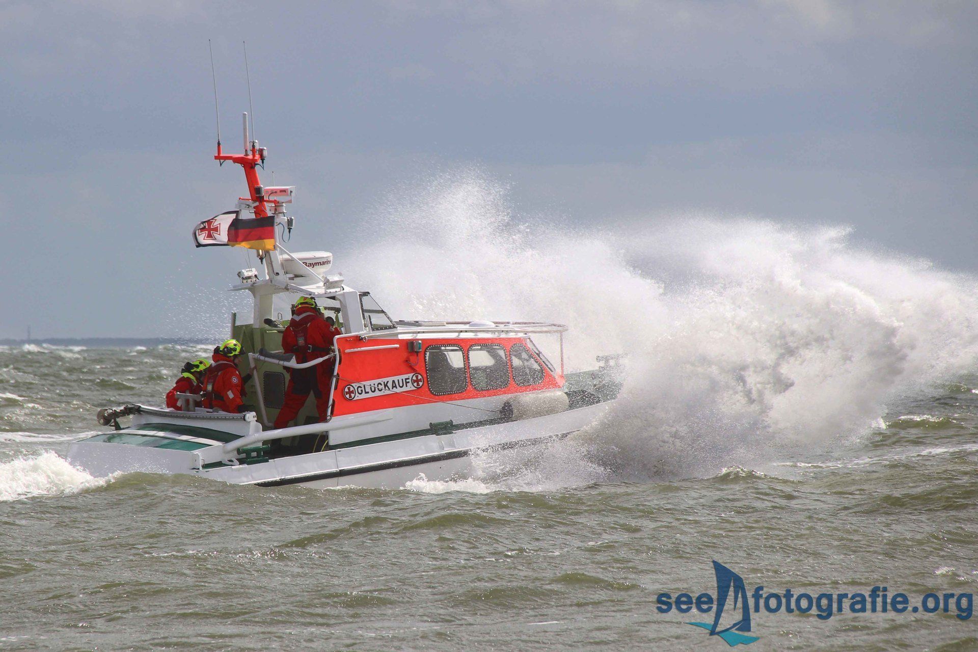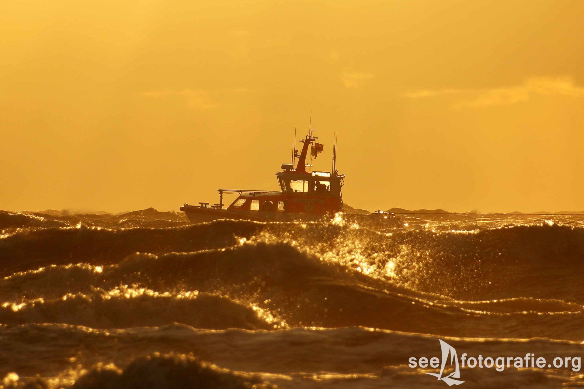 Zuerst fuhr der 27,5-Meter Seenotkreuzer mehrmals, leider sehr langsam, an uns und den anderen Besuchern vorbei. Danach wurde die GLÜCKAUF, das Tochterboot, von Bord gelassen und die Besatzung zeigte wie leistungsstark das kleinere und wendigere Boot ist. Dank der Wellen waren die Manöver sehr fotografenfreundlich. Gegen uns Fotografierenden spielte nur die Sonne, und das sprichwörtlich. Genaues Gegenlicht machte es schwierig alles fotografisch Mögliche aus der Vorführung heraus zu holen. Das Demonstrieren der Feuerlöschkanonen bildete den Abschluss dieser Vorführung.