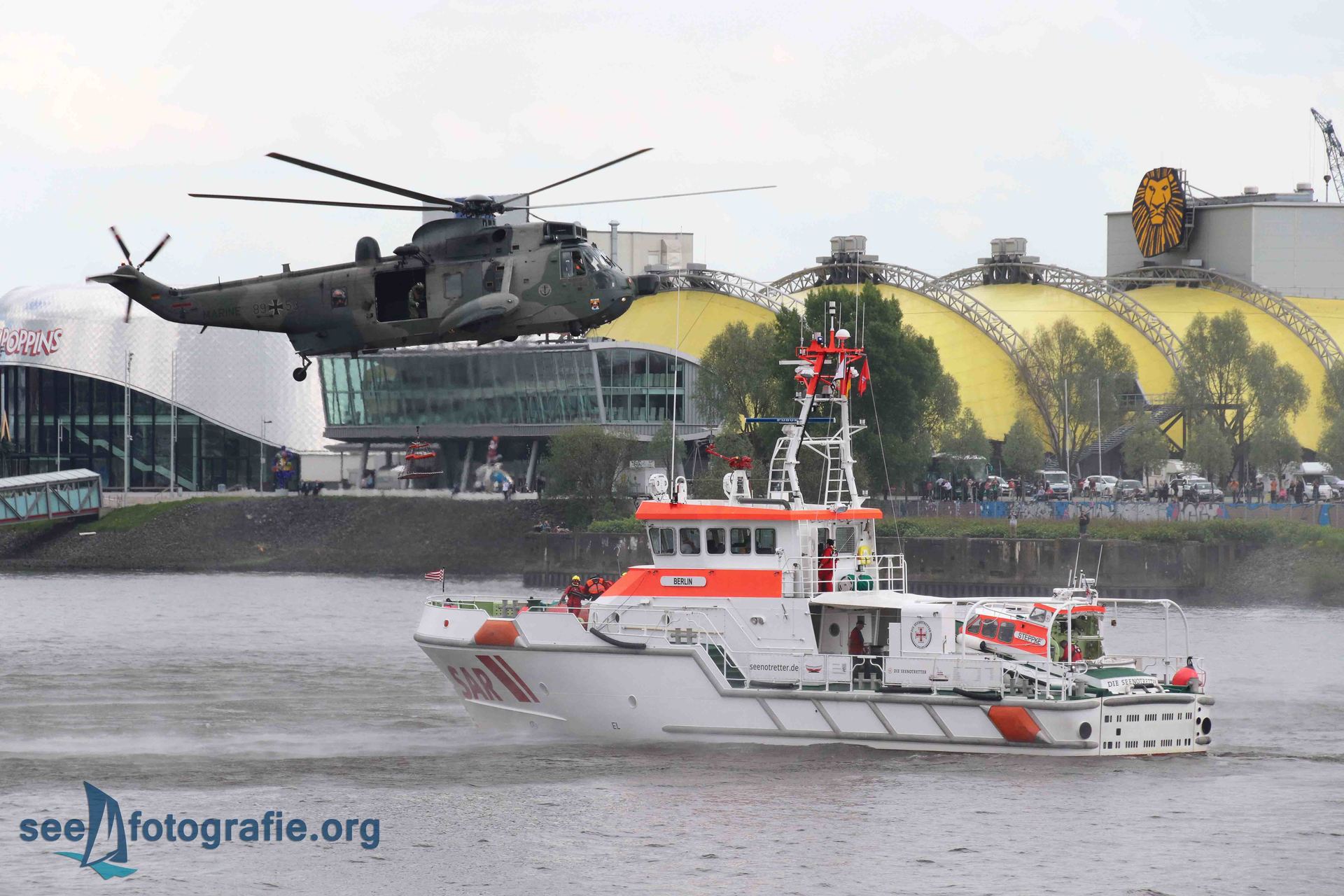 An den Landungsbrücken lag das ehemalige Feuerschiff BORKUMRIFF. Mit einer Spende an den Verein, welcher sich um den Erhalt des Schiffes kümmert, erhielten wir Zutritt auf das Schiff. Vom Vorschiff aus hatten wir perfekten Blick auf die Elbe. Nun warteten wir auf den Programmpunkt "SOS - Retter in Aktion". Die Retter sind Männer und Frauen der Feuerwehr, THW, DLRG, Polizei, Marine und der DGzRS. Das gezeigte Szenarium begann mit dem Ausbrechen eines Feuers auf einem Lastkahn. Daraufhin kam ein Polizeihubschrauber mit Rettungsschwimmer herangeflogen. Die Retter sprangen ab und retteten die Überbordgegangenen auf das Tochterboot des Polizeikreuzers BÜRGERMEISTER WEICHMANN, danach kümmerte sich die Hamburger Feuerwehr mit dem Löschboot BRANDDIREKTOR KRÜGER um den gezeigten Brand. Da noch weitere Rettungsaktionen gezeigt werden sollten, kam jetzt der Seenotkreuzer BERLIN zum Einsatz: Das Tochterboot STEPPKE wurde zu Wasser gelassen und nahm aus einer zuvor vorbereiteten Rettungsinsel zwei Schiffbrüchige auf. Nach einer kleinen Runde wurde STEPPKE wieder auf die BERLIN gezogen und ein zweiter Hubschrauber kam heran geflogen: Ein SEA KING aus Nordholz kam nach Hamburg geflogen, um uns Zuschauern zu zeigen, wie Gerettete im Ernstfall weiter versorgt werden. Vom Vorschiff der BERLIN wurden die Zwei in den Marinehubschrauber gewincht. Nach einem gemeinsamer Überflug beider Hubschrauber war die Vorstellung vorbei, dennoch blieben wir auf der BROKUMRIFF und warteten auf den nächsten Punkt des Programms.